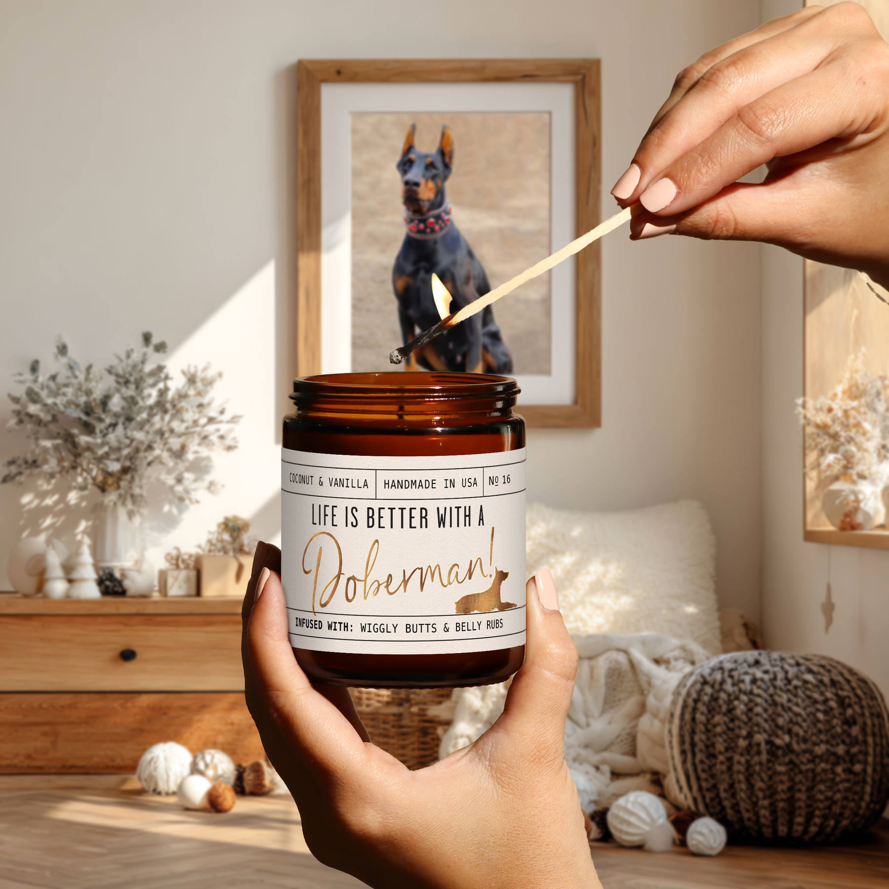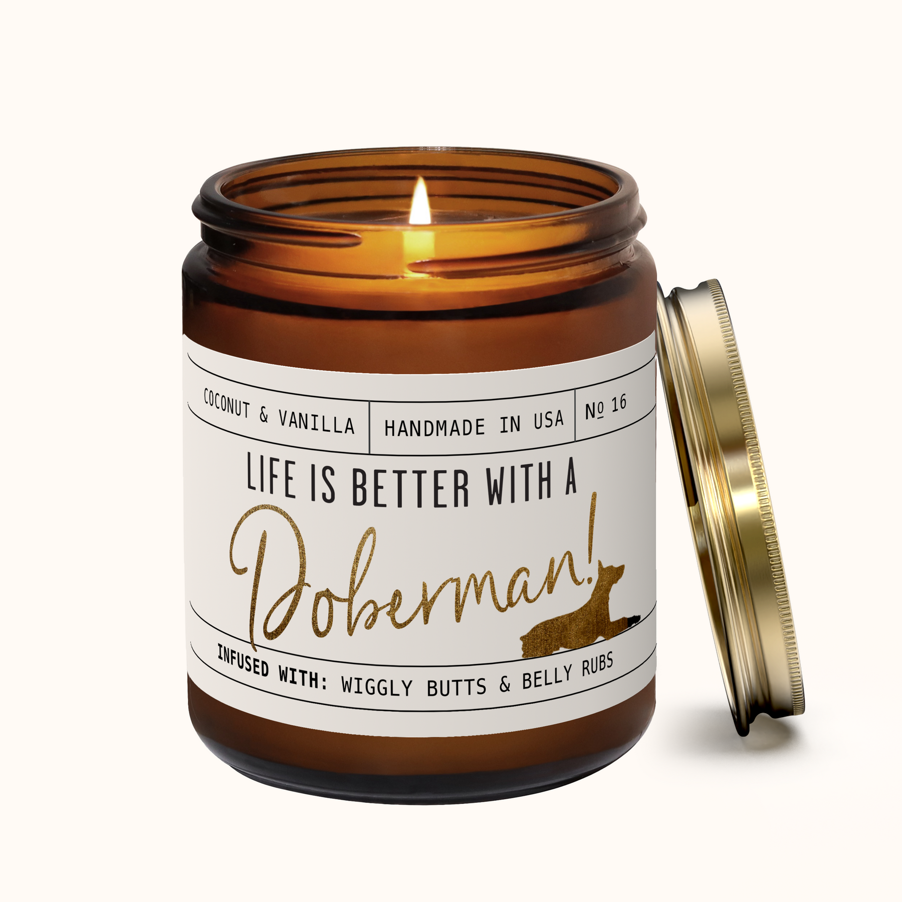'Life is better with a Doberman candle! Celebrate your furry friend whilst eliminating those unwanted pet odors with our adorable Doberman candle.