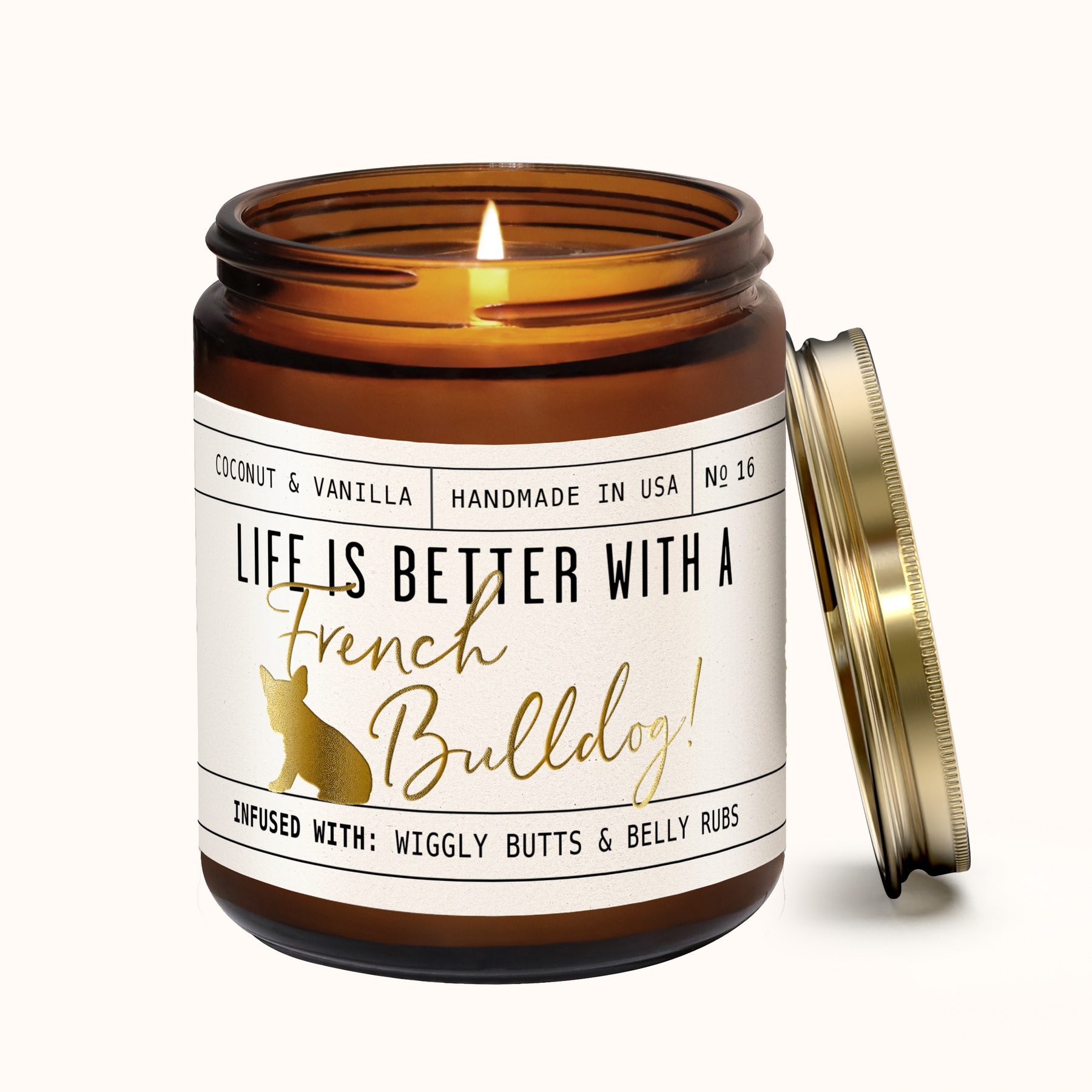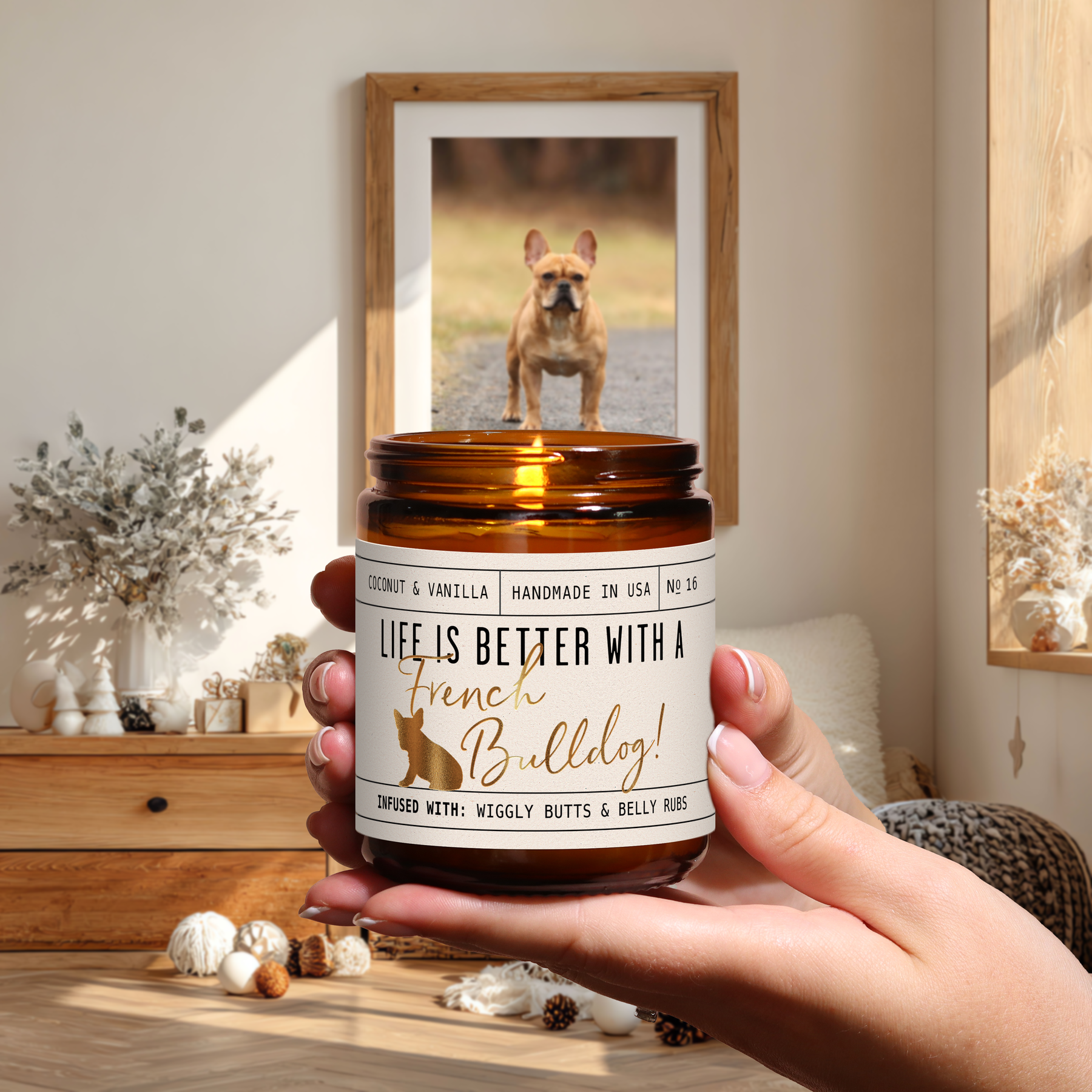 'Life is better with a French Bulldog candle! Celebrate your furry friend whilst eliminating those unwanted pet odors with our adorable French Bulldog candle.