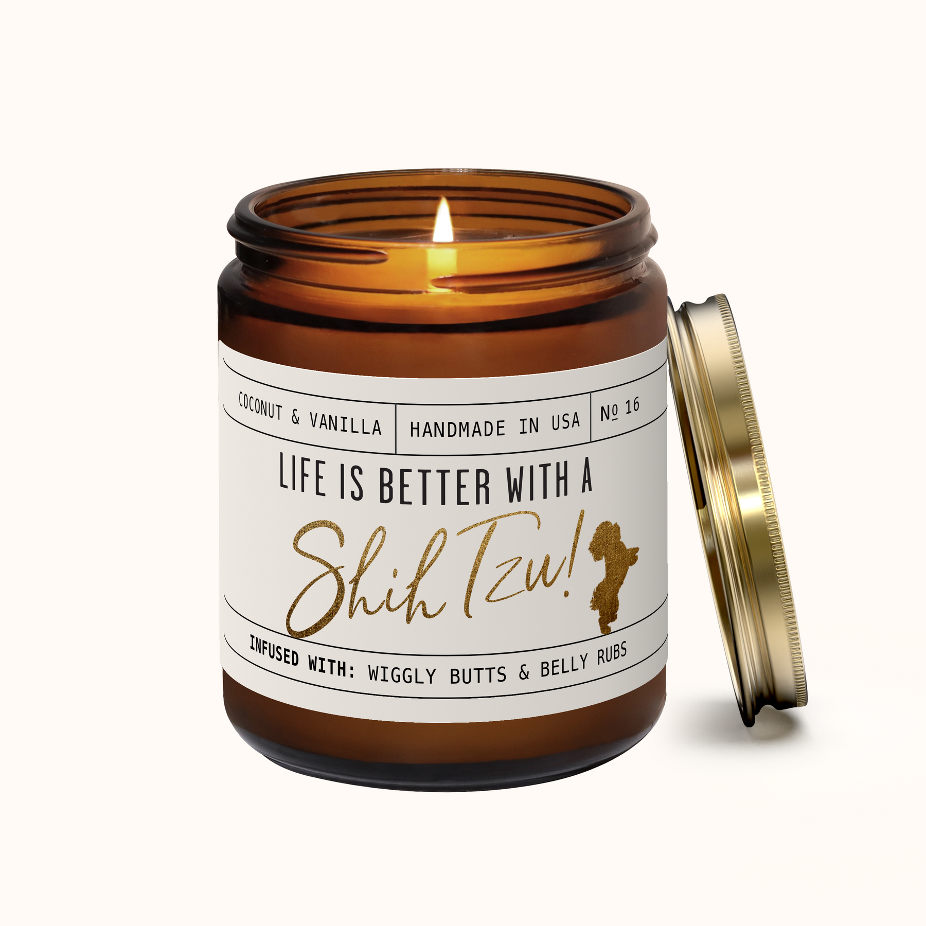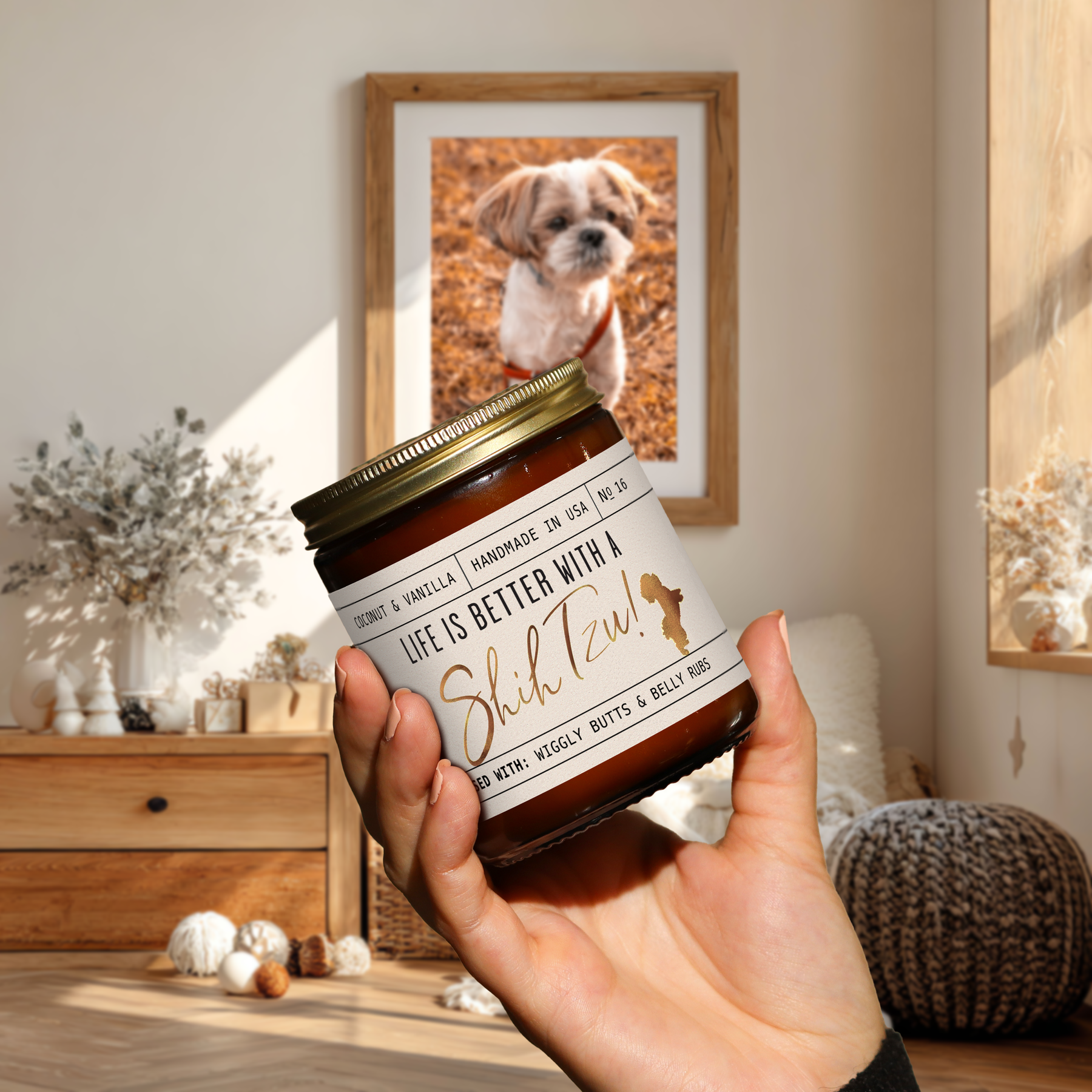 'Life is better with a Shih Tzu candle! Celebrate your furry friend whilst eliminating those unwanted pet odors with our adorable Shih Tzu candle.