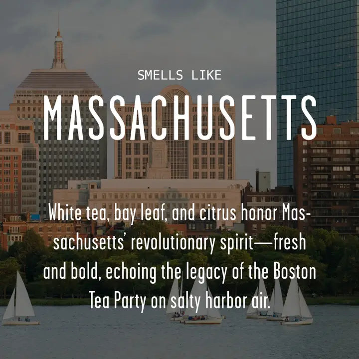 The Bay State & the origin of the Boston Tea Party is appropriately represented through a fresh scent blend of ‘White Tea, Bay Leaf & Citrus’