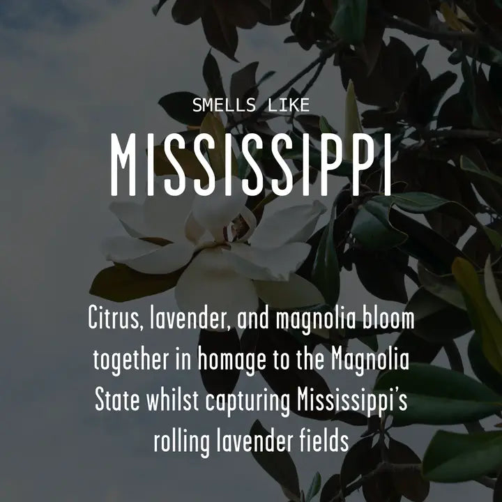 In homage to the Magnolia State, and the rolling Spanish Lavender Fields, we've blended together Bright Orange, Soothing Lavender & Magnolia to fill the room with the scent of Mississippi.